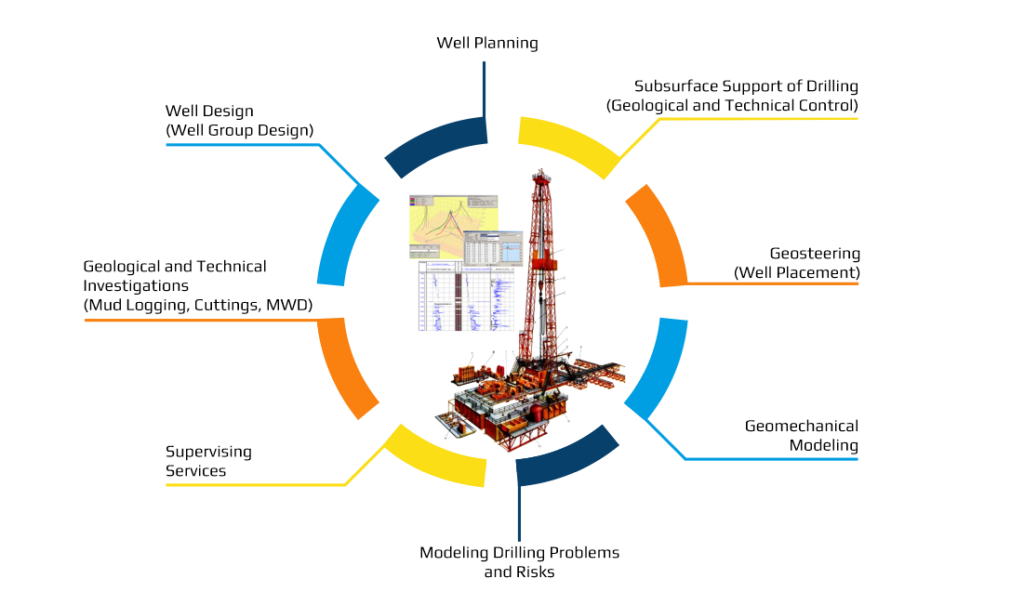 24/7 online geological support and technology control of drilling operations, including MWD (gathering and analyzing recorded measurements), correction and recalculations of properties and predicted characteristics, model updates, supervising and auditing of project implementation, control over drilling performance indicators, developing and approving measures and solutions while drilling, real-time adjustment of project solutions, HazOp studies. Correlation to reservoir geology, casing design and well TD (bottomhole). Assessment of borehole condition while drilling, recommendations to increase ROP (rate of penetration) or minimize drilling risks