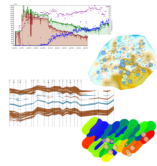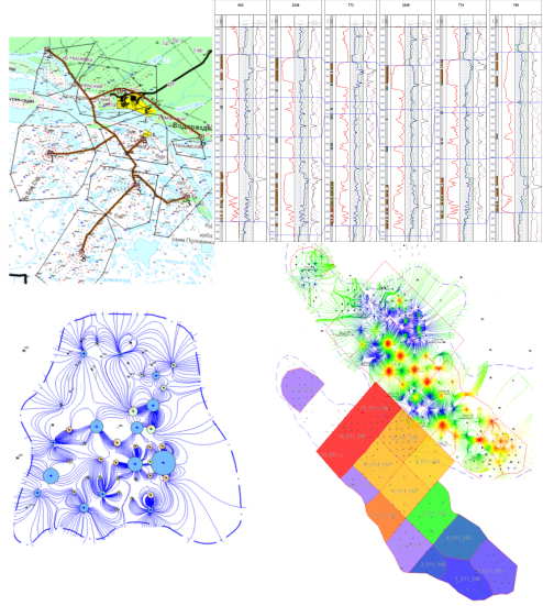 Визуализация геолого-промысловой информации по скважинам, участкам, месторождениям. Построение регламентных карт. Масштабная печать документов, карт и профилей. Импорт изображений в различных форматах, возможность установки координат, оцифровки